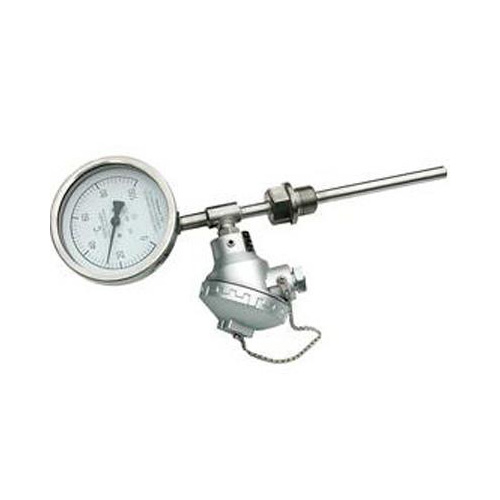 採用雙金屬溫度計與熱電偶/熱電阻一體的方式,既滿足現場測溫需求,亦滿足遠距離傳輸需求,可以直接測量各種生産過程中的 -80-+500 ℃範圍内液體、蒸氣和氣體介質以及固體表面測溫。